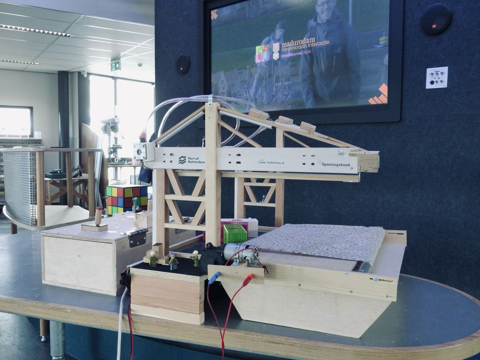 Madurodam commissioned the team to think about improving their current interaction in the park called, "Regulate Port Traffic. The team then created the research question. The research question of this project is, "What does a realistic harbor crane look like to scale and how can it best be controlled?". After drafting the main question, a long period of research and construction of a model, with all aspects incorporated, followed.In summary, we can conclude that the process of creating the scale model and coding all the parts for Madurodam was a very challenging but enjoyable task. Through precise programming and executions of the codes we wrote, the team managed to implement the desired functionalities. By creating a functioning and realistic model, everything comes together to form an overall whole. It can be concluded that the research question was met and Madurodam can receive a nice report.Several recommendations can be derived after this research. For example, it is recommended to start using an electromagnet instead of a suction cup system used today. It also advocates the addition of a game element to promote flow and motivate people to play the interaction. Furthermore, it is also recommended that a conveyor belt be added to the boat in conjunction with the game element so that the containers can return to the dock.Finally, time can be invested in adding a start button so that the interaction is not constantly on. A roller bank can also be placed on the dock so that all the blocks will roll to the back and there is always enough room for the blocks to come off the boat using the conveyor belt. Finally, we can look at centering the electromagnet so that it can always hang straight above the container.